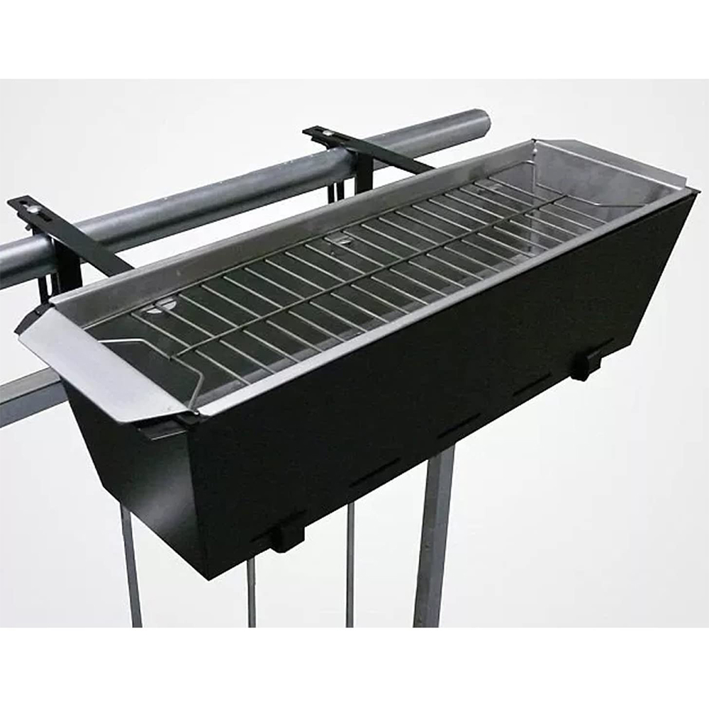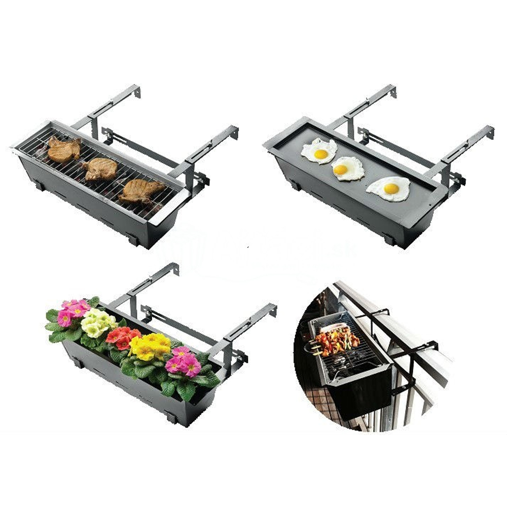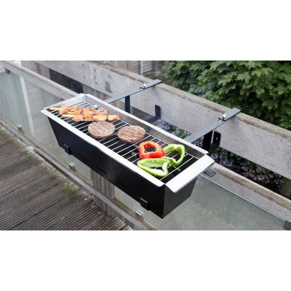 Un práctico y resistente asador de balcón fabricada de hierro. Dispone de unos anclajes para colocarla en el balcón de casa de forma fácil y segura (anclaje regulable apto para canceles de 11 a 15 cm de anchura aprox.).