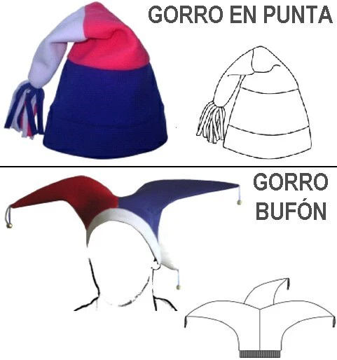 TELA GORRO BUFON EJ: ESPONJA POLYESTER, POLAR, ETC. PRETINA EJ: RIB O LYCRA. TELA GORRO EN PUNTA EJ: POLAR, TEJIDO FANTASIA, ETC.