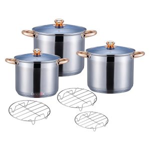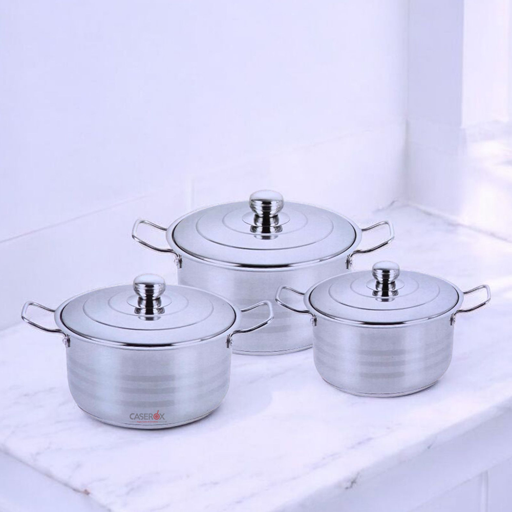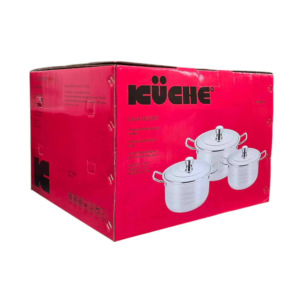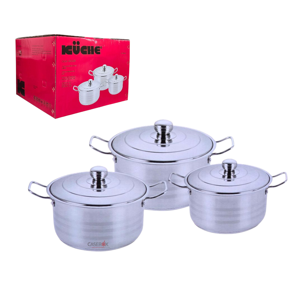 El Juego de 3 Ollas KUCHE de Acero Inoxidable incorporan tecnología multicapa de máxima calidad, son ideales para cocciones rápidas y a altas temperaturas. El acero inoxidable es uno de los mejores y tradicionales materiales usados para cocinar, con el cual puede obtener alimentos saludables.