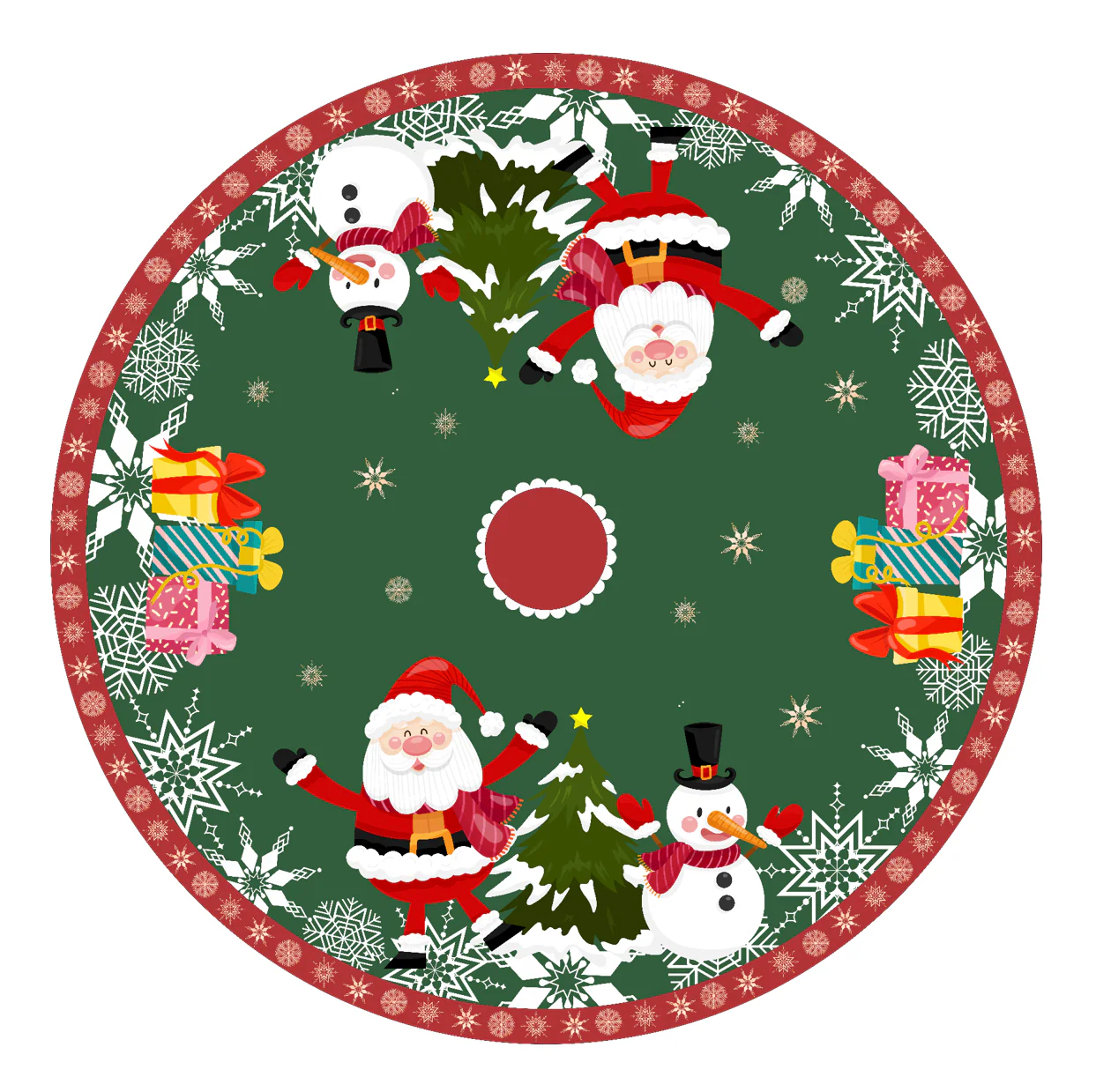 Esta tela para el pie de árbol es resistente al desgaste y ofrece una base sólida para tu árbol navideño. Su diseño facilita la limpieza y previene los daños en el suelo, proporcionando una decoración práctica y festiva para la temporada navideña.